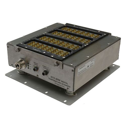 Model DTS4050/32Tx, Digital Temperature Scanner, accepts 32 thermocouple inputs. It incorporates RAM, Integral Low Pass Filters, 22 bit A/D converters, and a microprocessor, in a rugged stand alone module. An isothermal block is incorporated for the Uniform Temperature Reference (UTR) for each 32 channel input. NIST thermocouple tables for standard thermocouple types are stored in flash memory. The microprocessor uses these look-up tables to convert mV inputs to Engineering Units. Temperature data are output in °C, °F, °R, K, millivolts and counts.